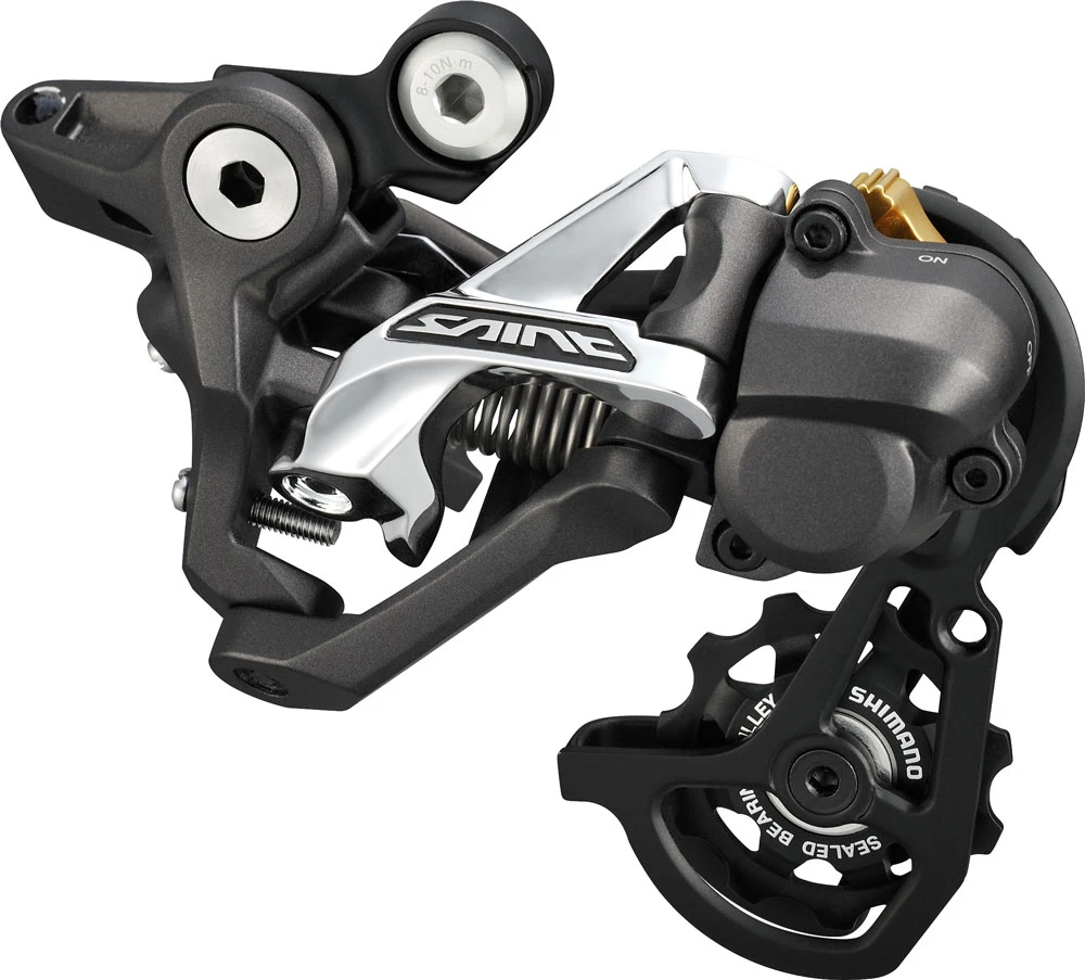 Le dérailleur arrière SHIMANO SAINT RD-M820, conçu pour le passage des vitesses à rapports rapprochés, est adapté au monde rude et tumultueux de la course par gravité grâce à son design plat.